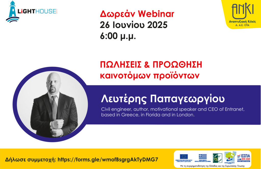 1ο webinar: “Πωλήσεις και προώθηση καινοτόμων προϊόντων”, την Πέμπτη 26 Ιουνίου 2025, στις 6 μ.μ. με εισηγητή τον κ. Λευτέρη Παπαγεωργίου. Το σεμινάριο θα εστιάσει σε στρατηγικές πωλήσεων και μάρκετινγκ για καινοτόμα προϊόντα/υπηρεσίες. Θα συζητηθούν τρόποι για την άντληση πελατών, την εφαρμογή νέων τεχνολογιών και το πώς να μετατρέψουν καινοτόμες ιδέες σε εμπορική επιτυχία, με έμφαση τόσο στην ελληνική αγορά αλλά και σε διεθνείς ευκαιρίες.