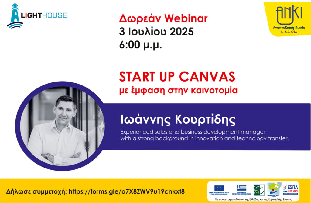 3ο webinar: «Start-up Canvas με έμφαση στην καινοτομία», την Πέμπτη 3 Ιουλίου 2025, στις 6 μ.μ. με εισηγητή τον κ. Ιωάννη Κουρτίδη. Το σεμινάριο θα εστιάσει στον τρόπο που μια νεοφυής επιχείρηση ή ιδέα μπορούν να χρησιμοποιήσουν το εργαλείο Business Model Canvas για να αναπτύξουν και υλοποιήσουν καινοτόμες ιδέες. Θα τονιστεί ο ρόλος της μοναδικότητας, της αξίας που δημιουργεί η καινοτομία και του πώς να εντάξουν στην αγορά το επιχειρηματικό τους μοντέλο.