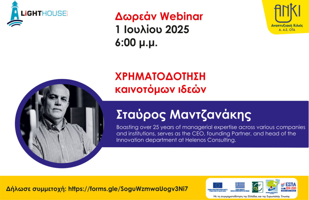 2ο webinar: «Χρηματοδότηση καινοτόμων ιδεών», την Τρίτη 1 Ιουλίου 2025, στις 6 μ.μ. με εισηγητή τον κ. Σταύρο Μαντζανάκη. Το σεμινάριο θα εξετάσει ευκαιρίες χρηματοδότησης για καινοτόμες ιδέες, startups, επενδύσεις στην Περιφέρεια, στην Ελλάδα, στην ΕΕ και όχι μόνο. Θα αναφερθούν προγράμματα επιχορηγήσεων, venture capital και angel investors που ειδικεύονται σε καινοτόμες λύσεις. Θα δοθούν συμβουλές για το πώς να παρουσιάσουν μια καινοτόμο ιδέα σε επενδυτές.